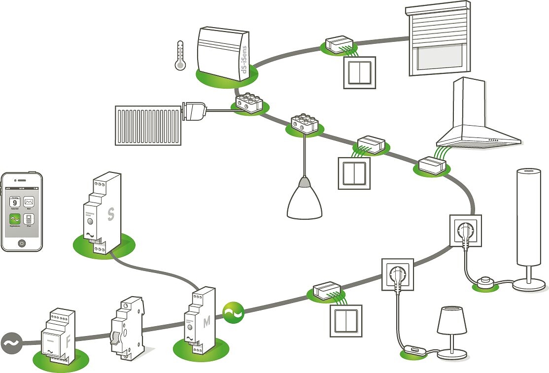 Das zentrale Element, das sogenannte digitalSTROM-Meter, wird direkt im Sicherungskasten installiert. Es koordiniert die Kommunikation aller angeschlossenen Geräte über das vorhandene Stromnetz. Über eine Verbindung zum digitalSTROM-Server wird der Zugriff auf das System per App, Tablet oder Smartphone ermöglicht – auch Sprachsteuerung ist integriert. Alternativ können Sie Ihre Systeme weiterhin ganz klassisch über bestehende Lichtschalter bedienen.